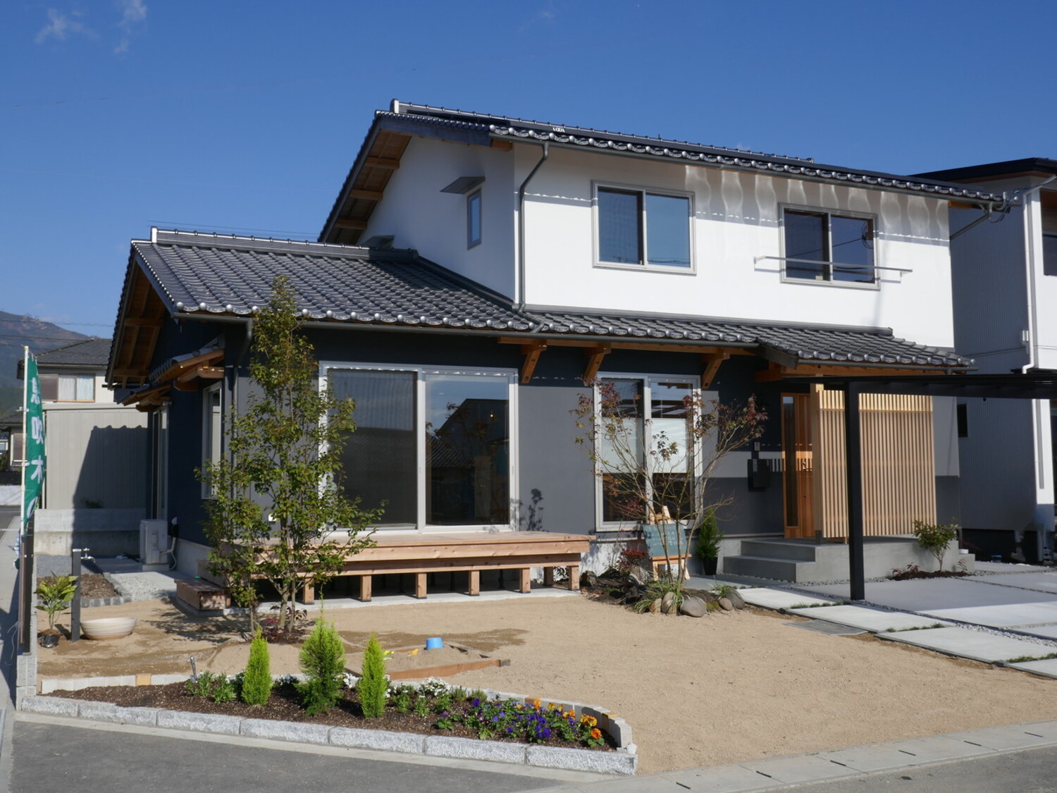 耐久性を重視し、瓦屋根とジョリパットの外壁を採用した落ち着きある外観。アプローチから庭までトータルに設計された佇まいは、団地の中でも一際目を引く存在です。流行に左右されず、歳月を重ねるほどに街並みに美しく馴染み続けます。