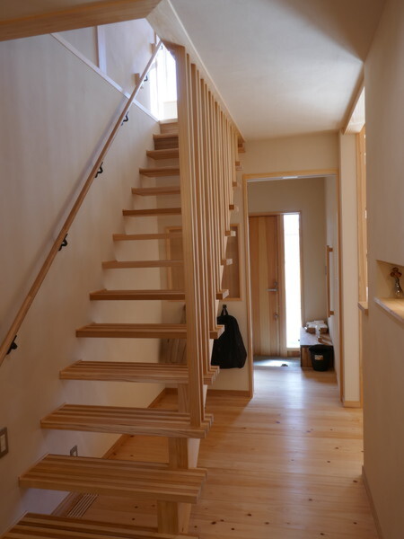 玄関を入ってすぐ、目に飛び込むのは軽快なデザインの階段。視線が抜ける設計にすることで、限られたスペースに開放感をもたらしました。階段下はカバンなどの定位置として有効活用。実用性をスマートに兼ね備えつつ、家の「顔」として美しく家族を迎え入れます。