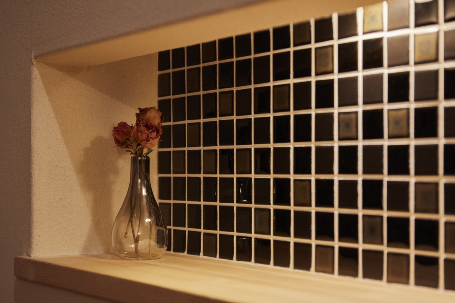 玄関を入ってすぐ、目に飛び込んでくる小ぶりなニッチ。奥に並ぶタイルは、住まい手と一緒に選び、DIYで丁寧に仕上げました。ふとした瞬間に目が合うその場所は、訪れる人を優しく迎え、家族の想い出を静かに紡ぎ続ける可愛らしい空間です。