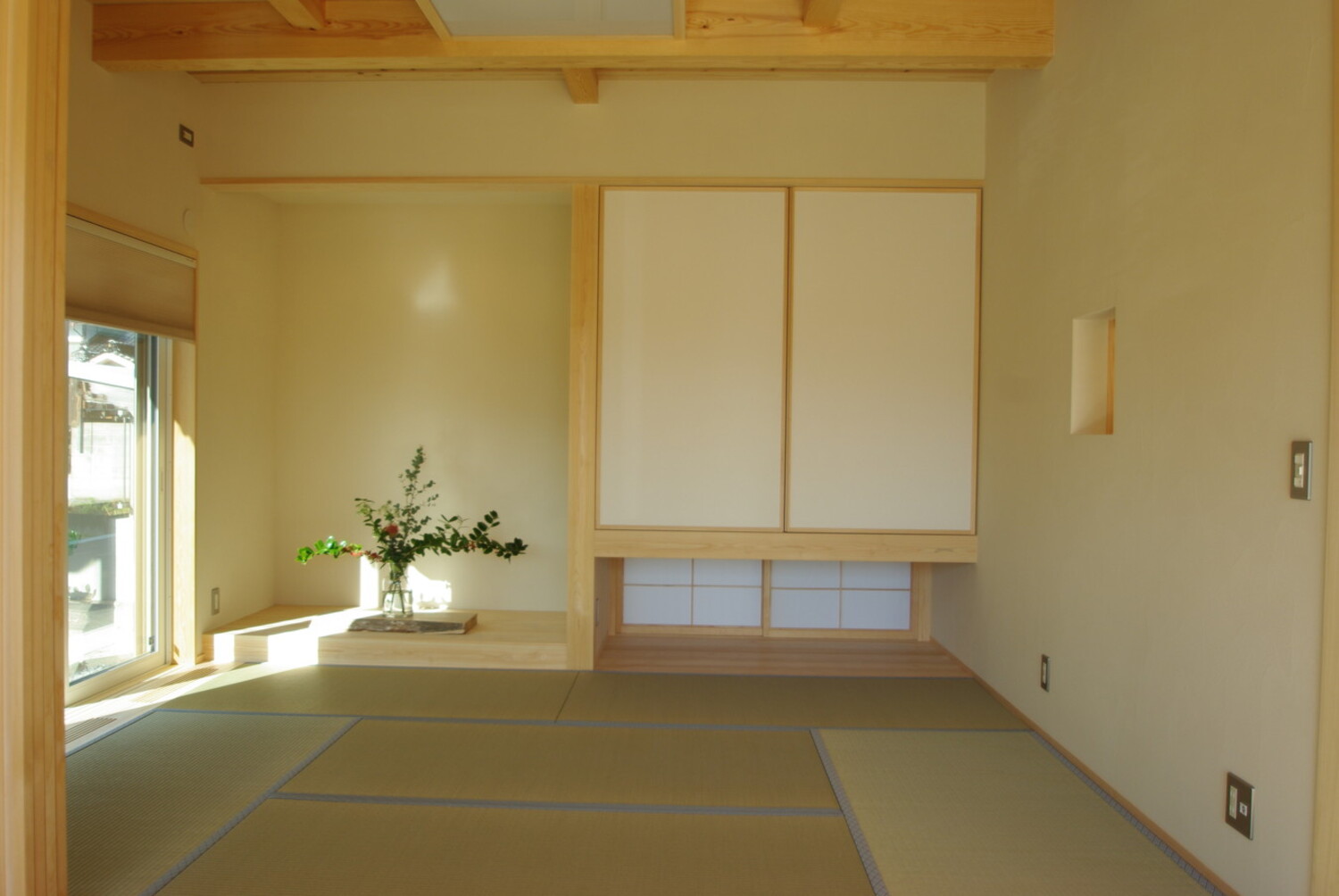 リビング横の和室は、季節の飾り物を愉しむ床の間を備えた、心安らぐ空間。奥様が活けた瑞々しい緑が、木の空間に美しい彩りを添えています。お子様の健やかな遊び場としても最適で、暮らしのなかに日本の伝統と家族の笑顔が自然に溶け込みます。