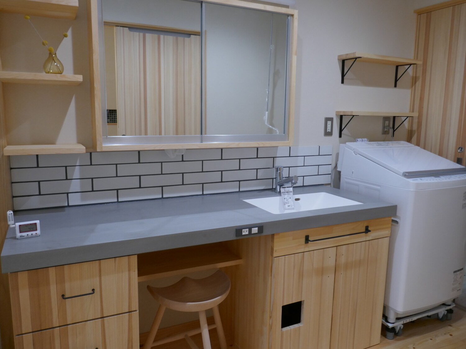 掃除のしやすさとデザインを追求した、オンリーワンの造作洗面台。機能的なグレーの天板に無垢の質感が映え、日々の家事を軽やかに支えます。壁面のタイルは住まい手との共同DIY。手仕事の温もりが、空間に世界にひとつだけの彩りを添えています。