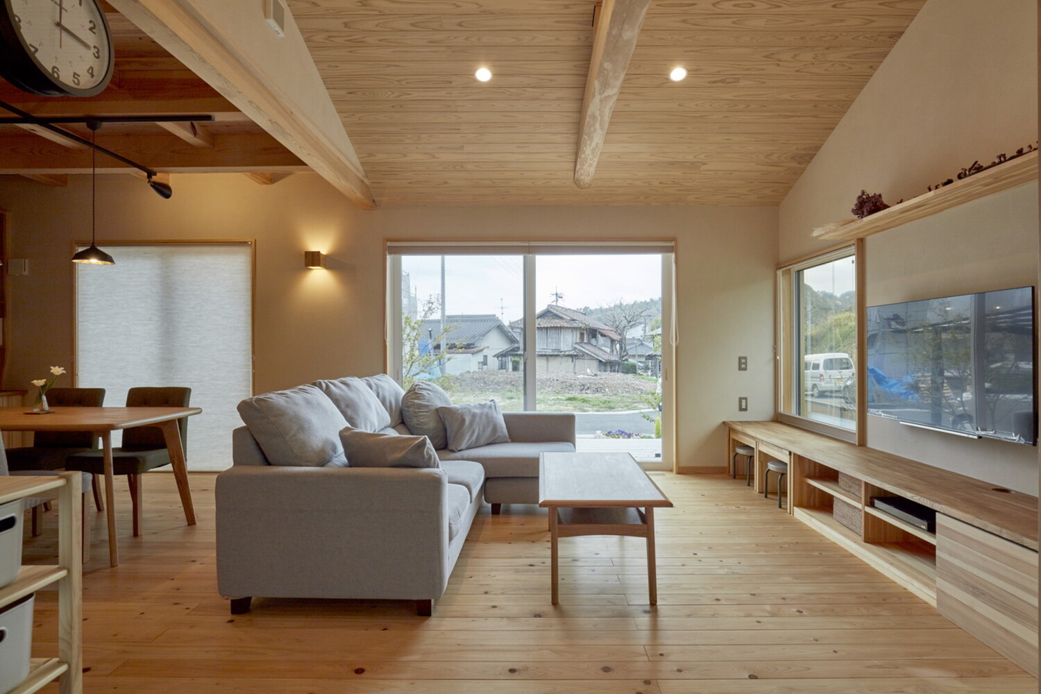 性能とパッシブデザインを追求したLDKは、自然の光と熱を味方につけた、おおらかな空間です。ダイニングや和室とひと続きになる設計は、どこにいても家族の気配を感じさせ、心地よい笑い声が自然と響き渡ります。