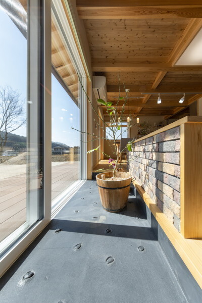 リビングの腰壁の裏側に広がるのは、太陽の恵みを蓄える黒い土間。レンガと土間が熱をじっくりと抱き込み、お家の中を安定した温もりで満たします。内と外を緩やかに繋ぐこの場所は、庭の気配を間近に感じられる安らぎの拠点です。