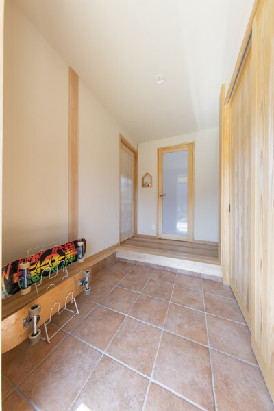 広々とした玄関は、お気に入りの趣味を愉しみながら仕舞える、ギャラリーのようなゆとりの空間。お仕事場であるサロンとプライベートな居住空間を、ほどよい距離感で緩やかに繋ぎます。日々のオンとオフを心地よく切り替え、暮らしに豊かなリズムを運んでくれる大切な場所です。