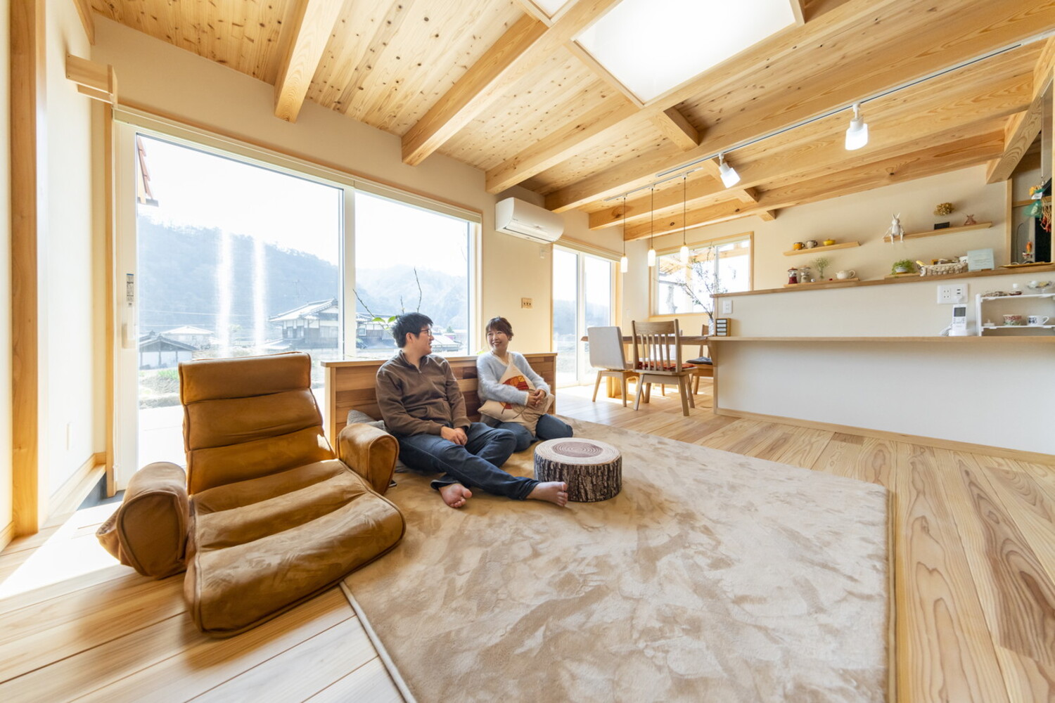 木の温もりに包まれる、開放感あふれるLDK。力強い梁が渡る大空間には、家族の歩みを飾る棚を設けて、自分たちらしい彩りを。健やかな木の香りと共に、日々の何気ない会話が弾む、家族の絆を育む中心の場所です。
