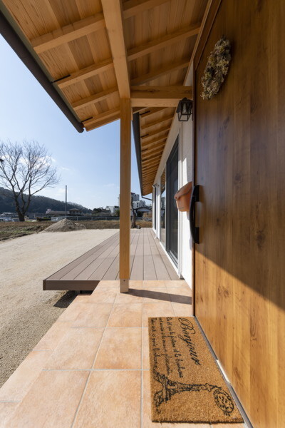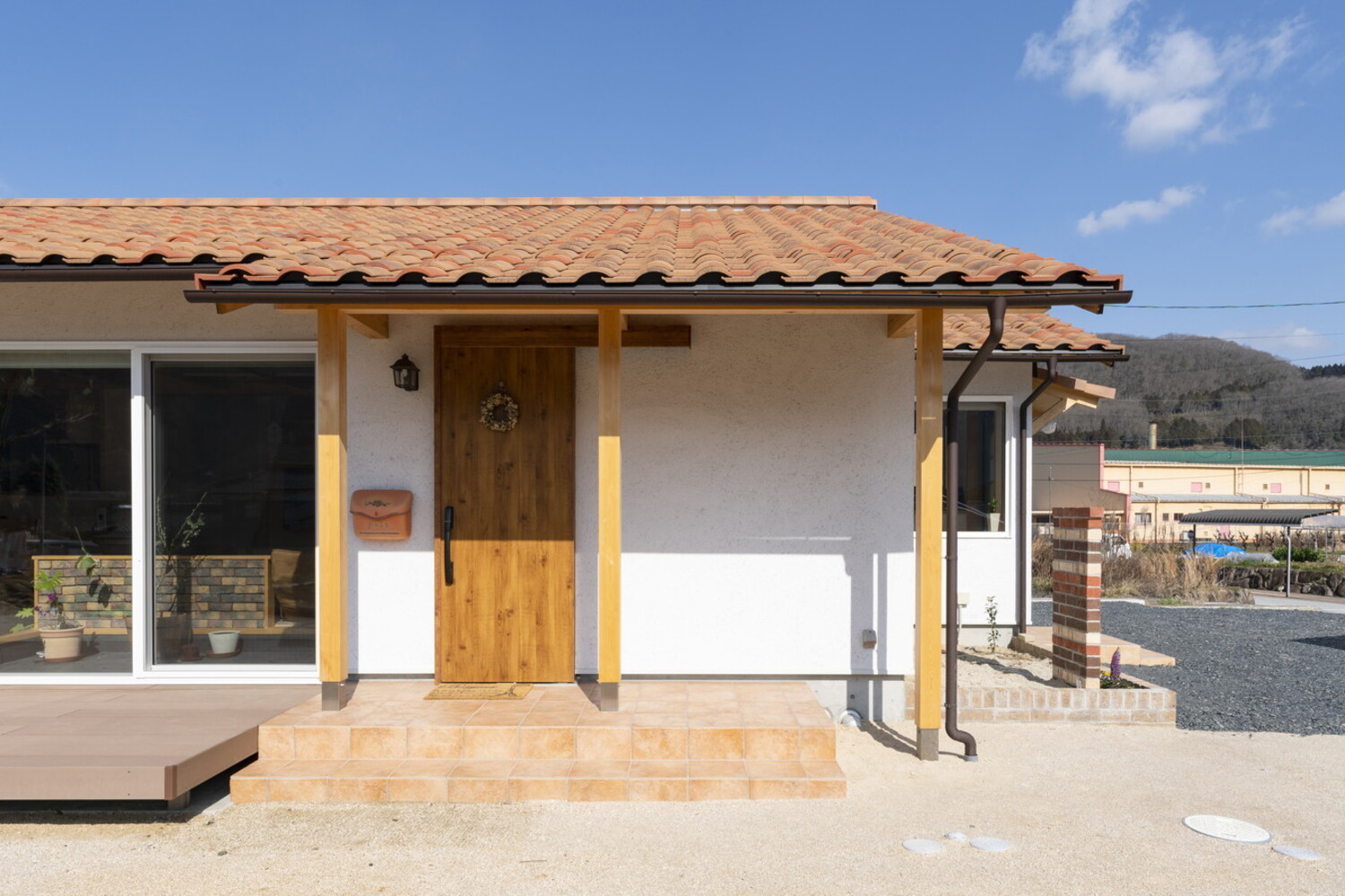 美しい大屋根が美作の空に映える、可憐な平屋。妻入りの緑の扉は、夢を叶えたサロンへの入り口。陽光降り注ぐ南側は家族が寛ぐ特等席。愛らしい佇まいに、訪れるお客様も住まうご家族も、等しく心華やぐ住まいです。