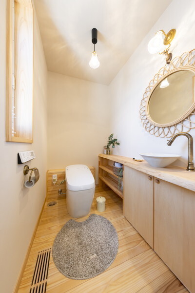 お客様も使われるトイレは、まるでお洒落なパウダールームのような装いに。鏡のフレームや照明、真鍮の質感にまで徹底的にこだわり、機能美と心地よいインテリアを両立しました。訪れるたびに気分が上がる、おもてなしの心が詰まった空間です。