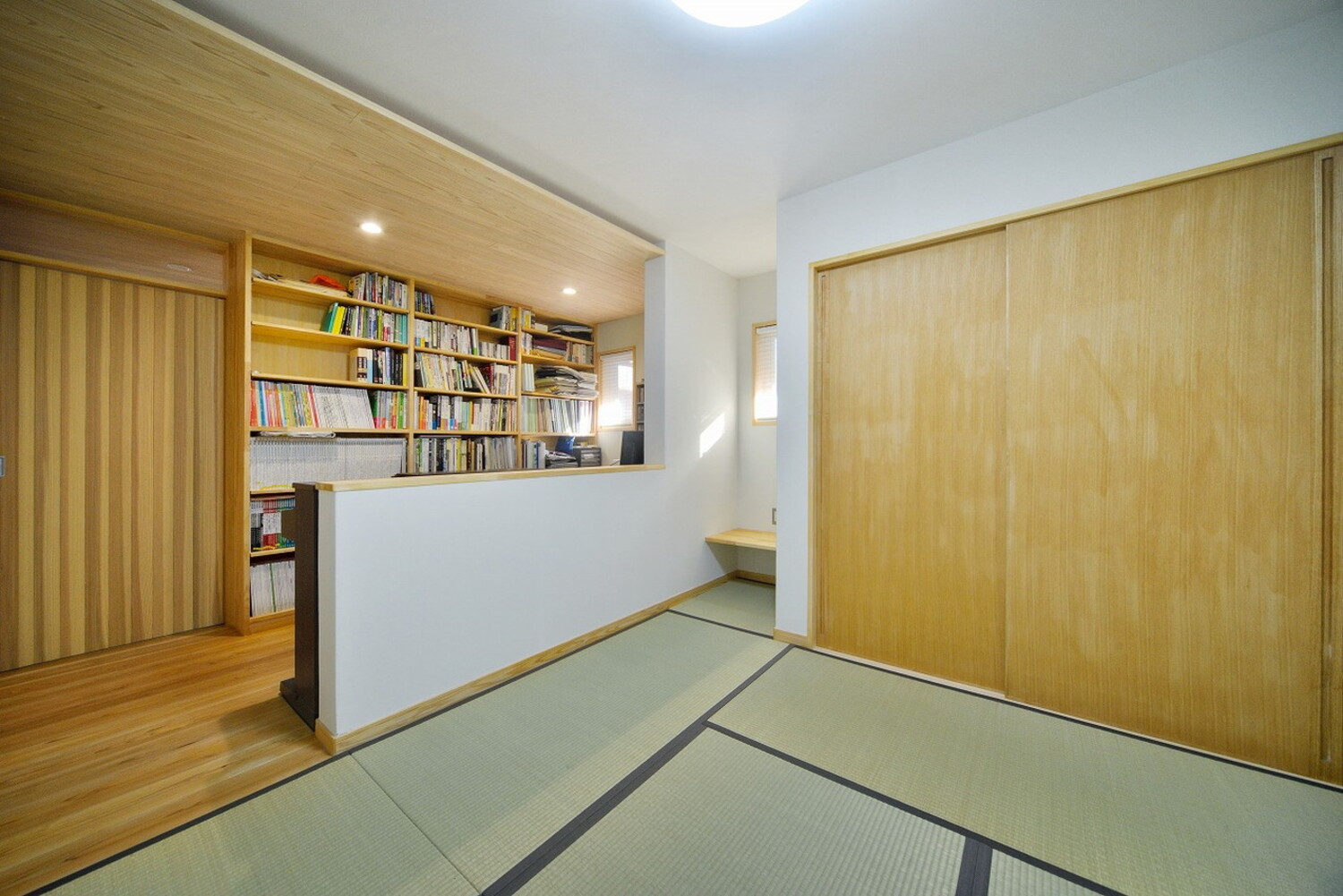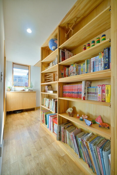 書斎を兼ねた畳敷きの寝室、廊下に設けた図書棚など、