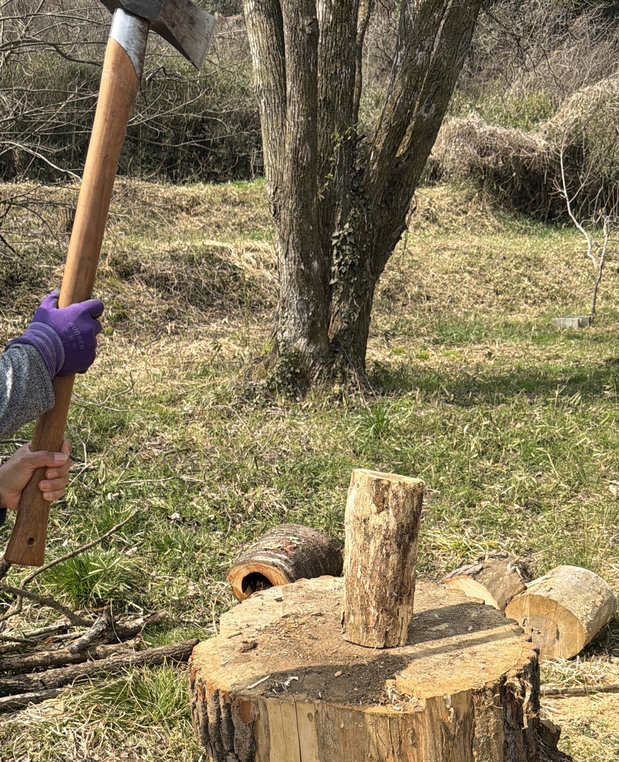 広い敷地の中で、大木を運び、チェーンソーで切って、さらに薪割りをして、積んで乾かしていく…。