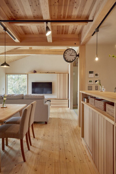 計算し尽くされた広々としたリビングは、ダイニングや和室とひと続きに。木の温もりと柔らかな光に包まれた空間は、どこにいても家族の気配を感じ、賑やかな笑い声が自然と聞こえてくるような温かさに満ちています。