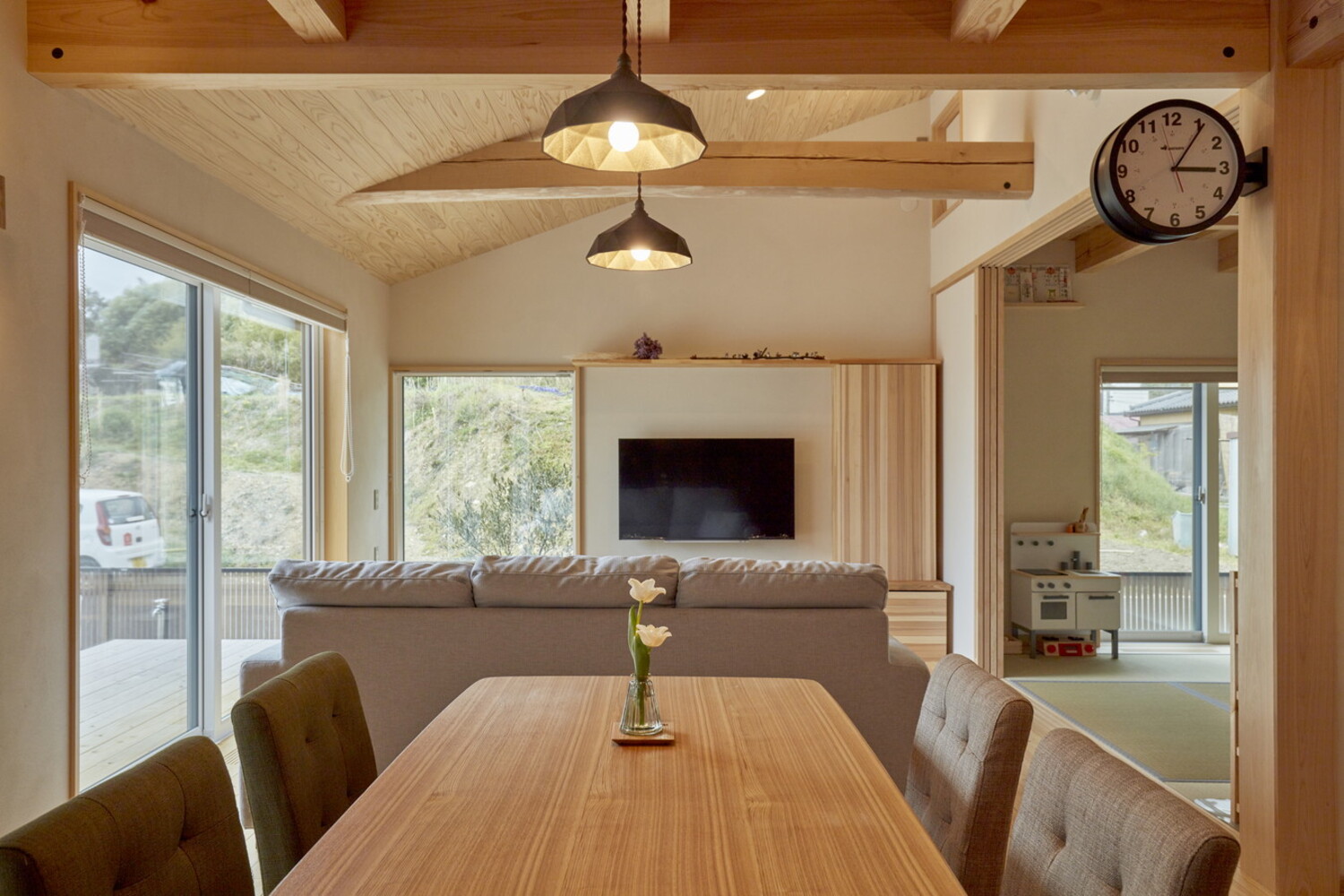 性能とパッシブデザインを追求したLDKは、自然の光と熱を味方につけた、おおらかな空間です。ダイニングや和室とひと続きになる設計は、どこにいても家族の気配を感じさせ、心地よい笑い声が自然と響き渡ります。
