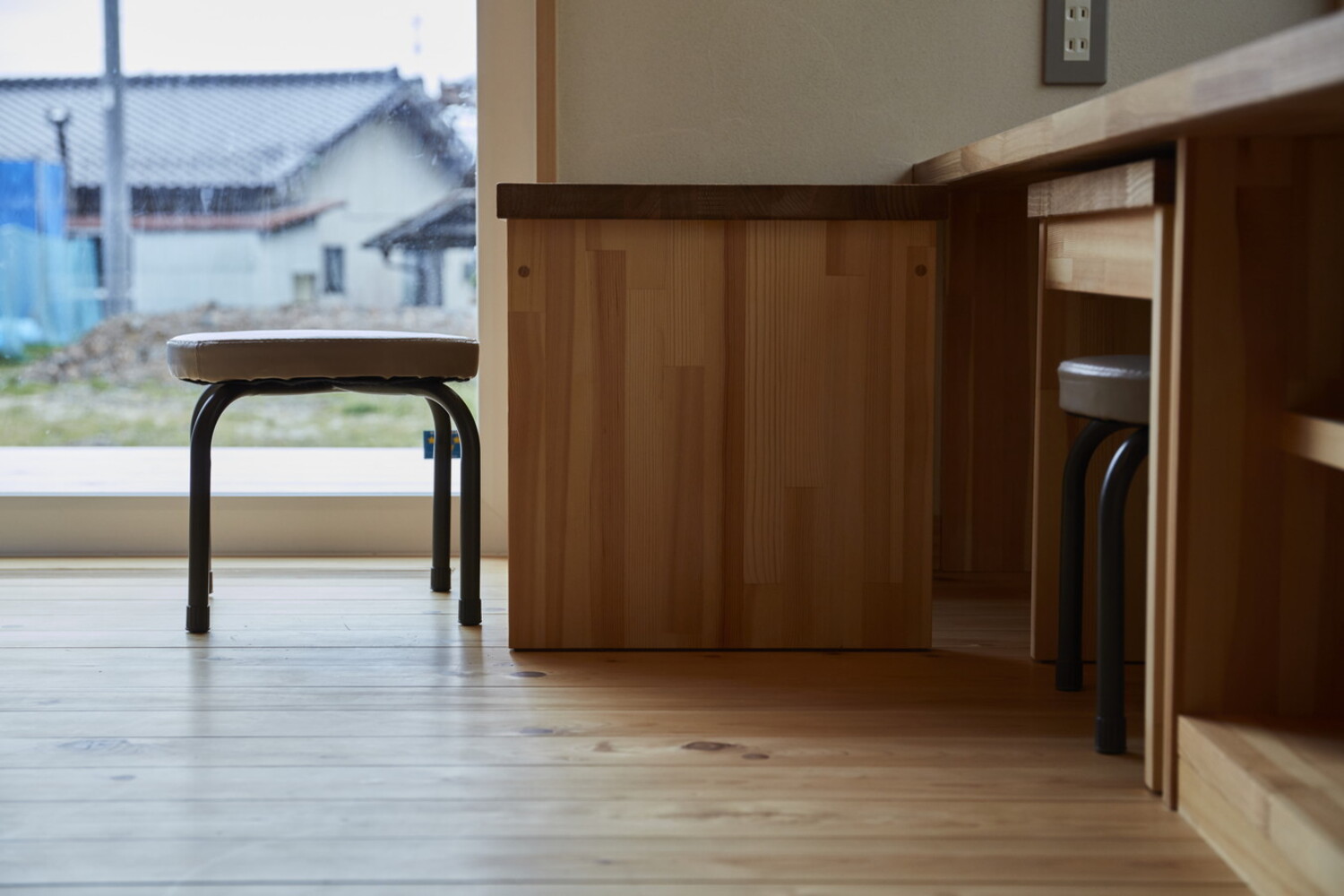 テレビ台の下に収まる機能的な木箱は、住まいの名脇役。時にはサイドテーブルとして、大勢が集まる日には予備の椅子として、場面に合わせて役割を変えます。限られた空間を賢く使いこなす、遊び心と実用性を兼ね備えた造作の知恵です。