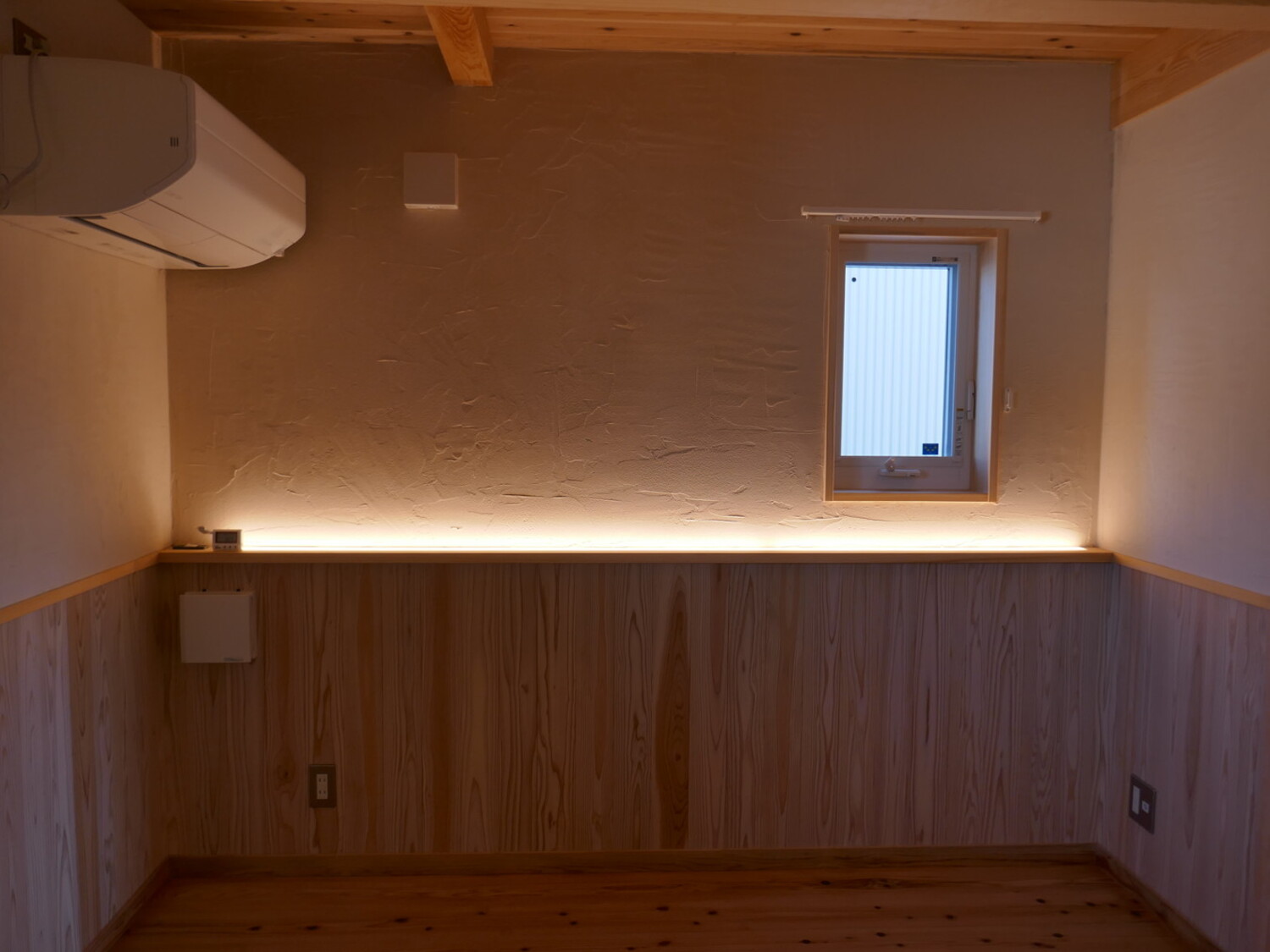 落ち着きを追求した寝室は、奥行きを持たせた腰壁が光や小物の置き場をスマートに制御します。DIYで仕上げた珪藻土の壁が間接照明に美しく照らし出され、家族の想い出とともに心安らぐ眠りの時間を優しく包み込みます。
