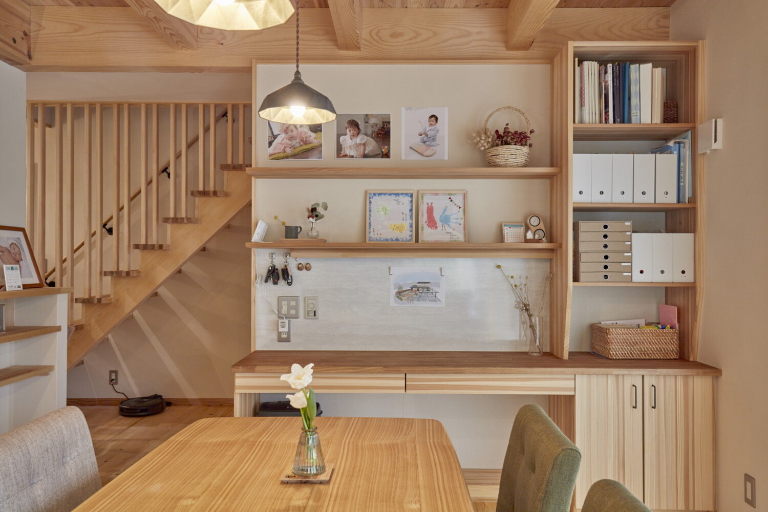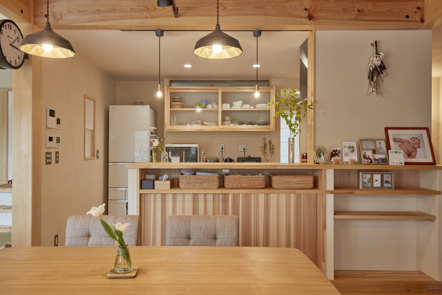 ダイニング横のキッズカウンターは、写真を飾るギャラリーや日用品の収納として活躍。将来は勉強スペースとしても使え、暮らしの変化に寄り添います。無垢の木が時を重ね、家族の成長を一番近くで見守り続ける家具です。