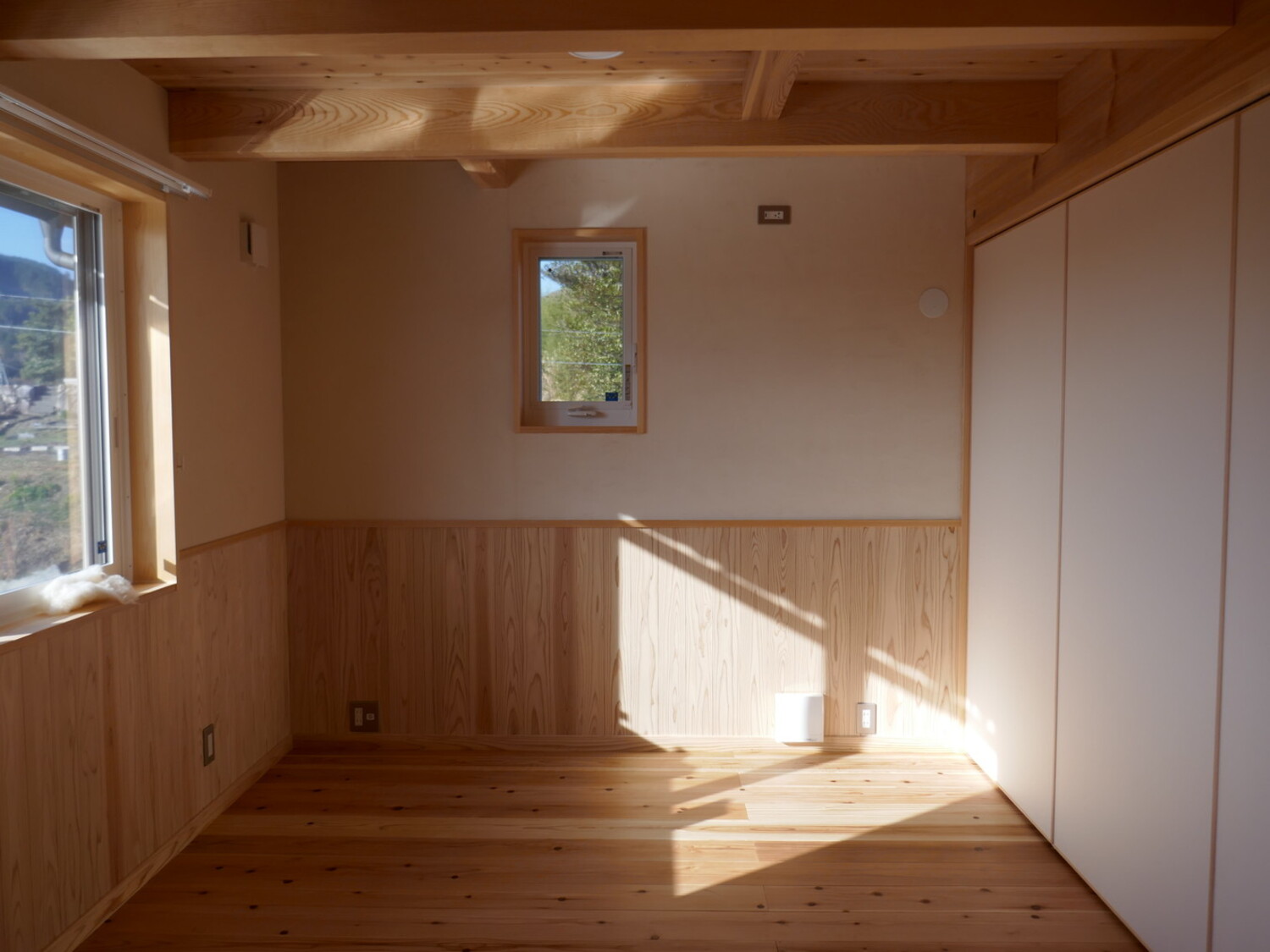 2階の子ども室兼ホールは、珪藻土の壁を保護する腰壁を回し、気兼ねなく過ごせる空間に。仕切りの扉は取り外して収納でき、家族の成長に合わせて大広間としても活用可能です。未来の暮らしを描き、自由度を高く設計しました。
