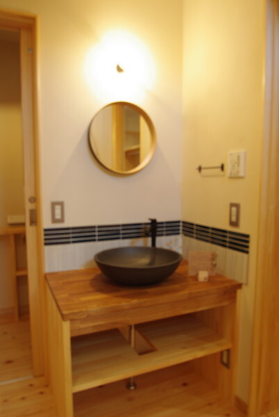 玄関横の造作手洗い台は、来客への細やかな配慮から生まれた場所。お気に入りのボウルや鏡が空間に自然と馴染みます。壁のタイルは住まい手自らDIYで仕上げ、日々の何気ない手洗いの時間を、愛着の湧く特別なひとときへと変えてくれました。