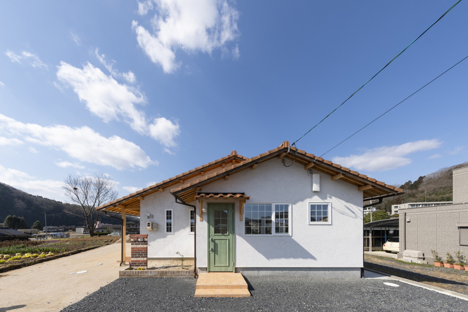 美しい大屋根が美作の空に映える、可憐な平屋。妻入りの緑の扉は、夢を叶えたサロンへの入り口。陽光降り注ぐ南側は家族が寛ぐ特等席。愛らしい佇まいに、訪れるお客様も住まうご家族も、等しく心華やぐ住まいです。