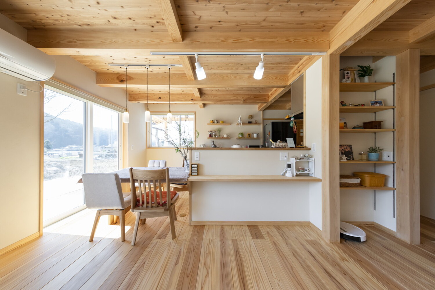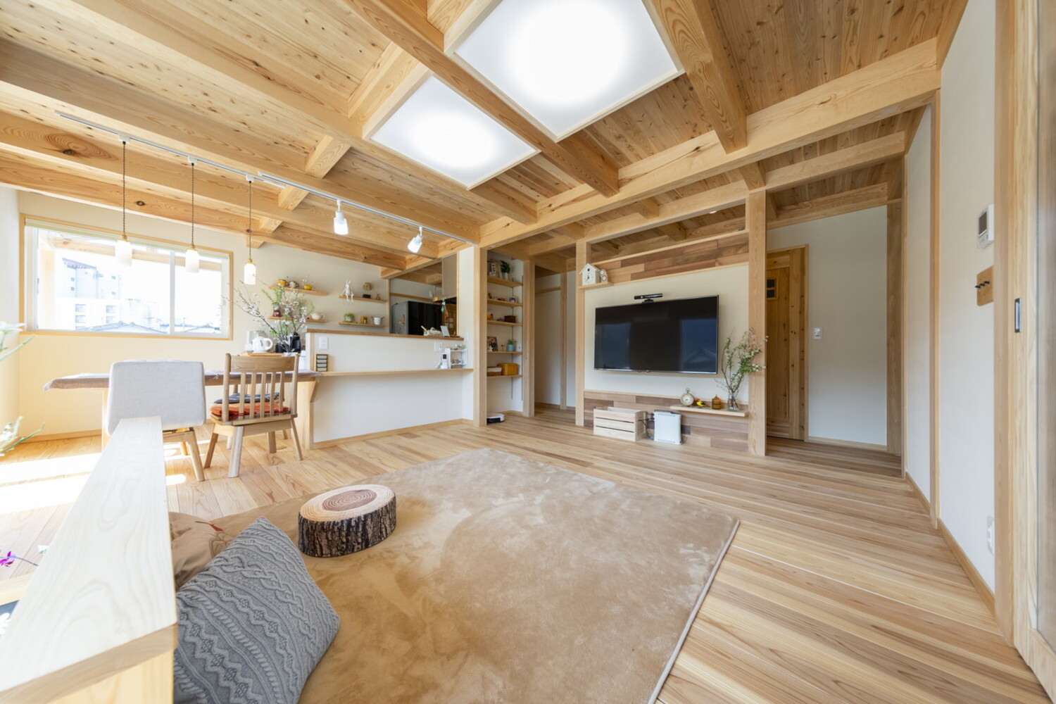 木の温もりに包まれる、開放感あふれるLDK。力強い梁が渡る大空間には、家族の歩みを飾る棚を設けて、自分たちらしい彩りを。健やかな木の香りと共に、日々の何気ない会話が弾む、家族の絆を育む中心の場所です。