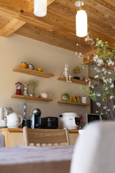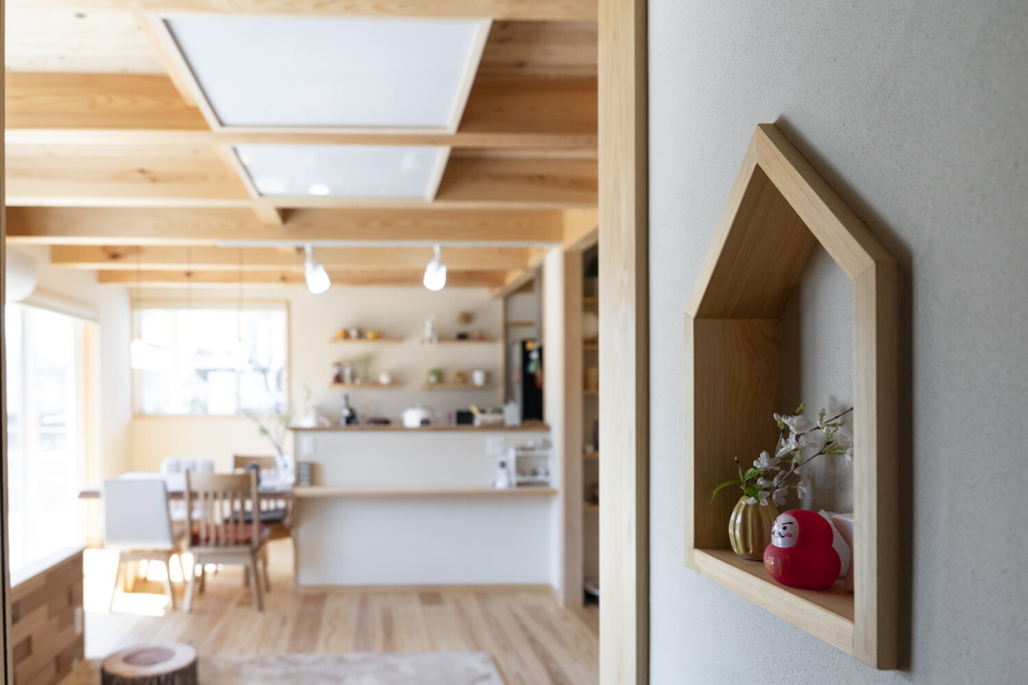 キッチンの背面に設けた飾り棚は、日々の暮らしに彩りを添えるギャラリー。お気に入りの雑貨や季節の小物がふとした瞬間に目に入り、心をふわりと和ませてくれます。自分らしさを飾り、愉しむ、豊かな時間が流れます。