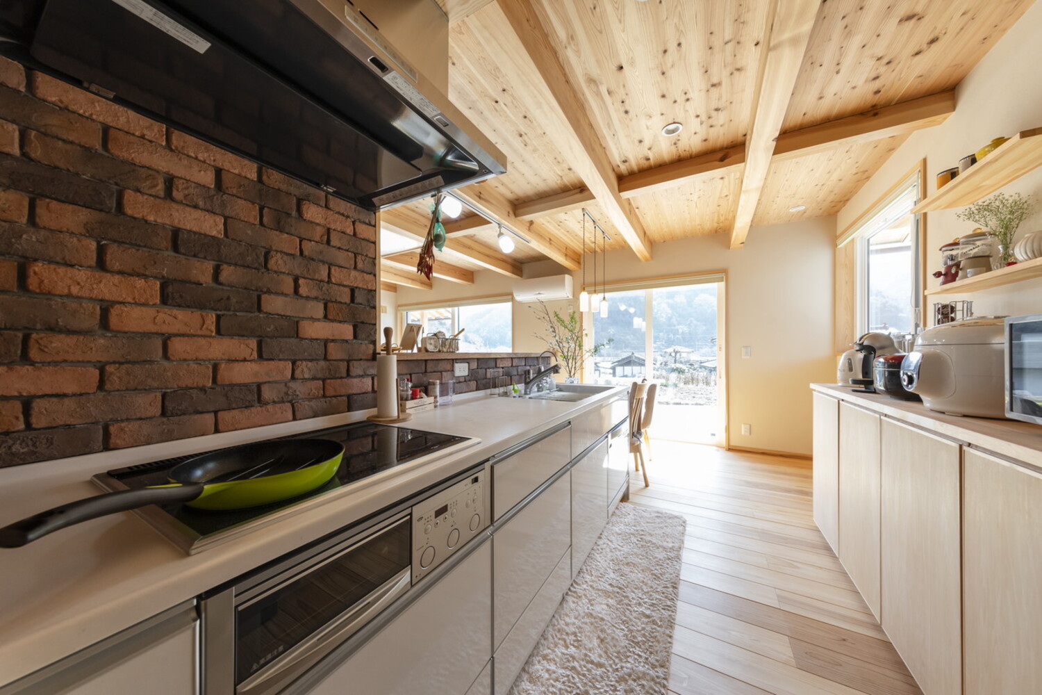 タカラの機能性に、DIYで施したレンガタイルの温もりを重ねて。LDK側からは手元を隠す設計にすることで、生活感を抑えつつ、お気に入りの素材が主役となる空間に。美しさと使い勝手を、設計と職人の手で鮮やかに両立しました。