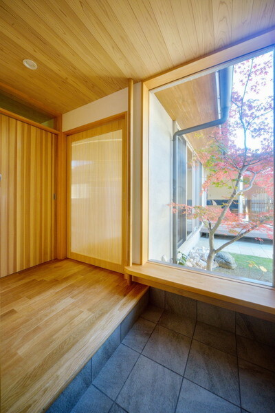 玄関へ入ると、計算されたベンチ越しに美しい中庭がお出迎え。